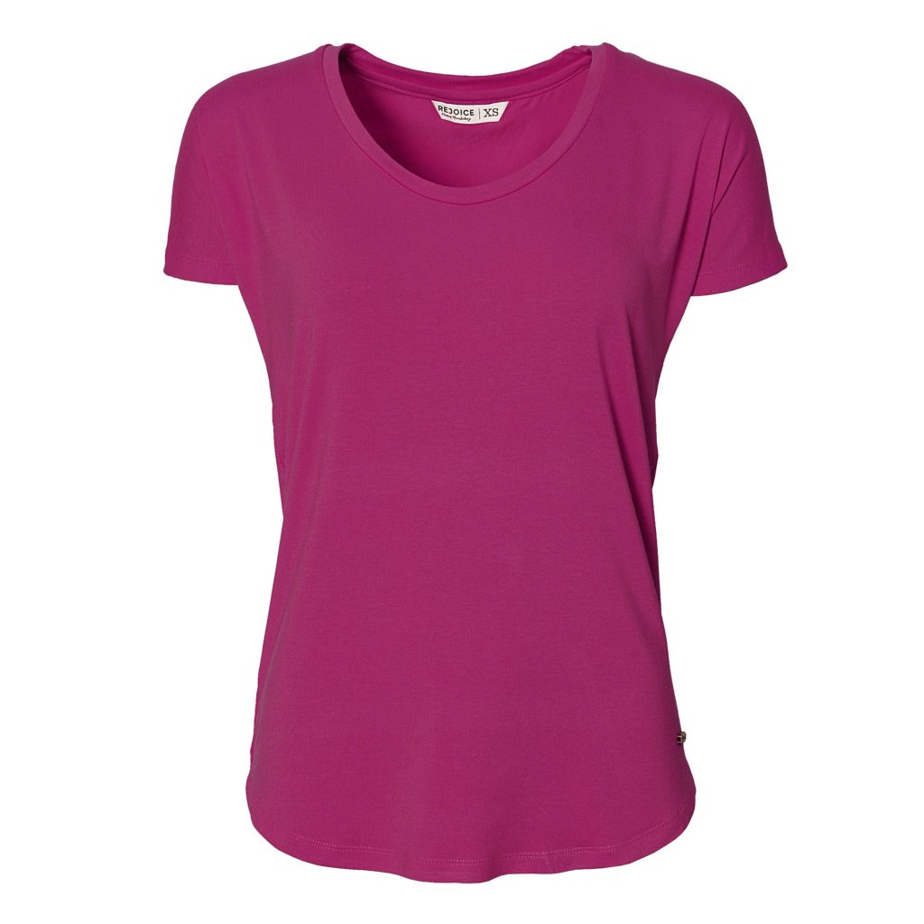 Dámské jednobarevné tričko s výstřihem je doplněné kokosovou etiketkou z blízké knoflíkárny.