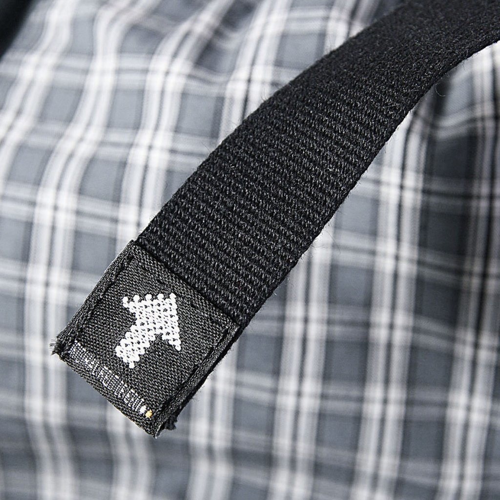 Na přední straně pasu je originální vytkávané poutko, kterým lze přebývajícící část pásku zachytit.