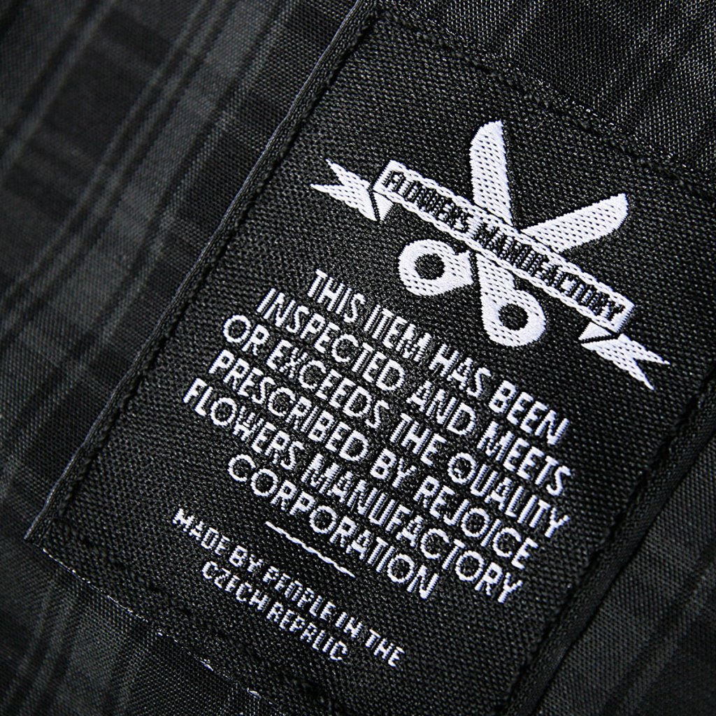 Na levé straně předního dílu je našité logo na vytkávané etiketě. V pase jepro větší komfort při nošení je všita plochá široká guma.